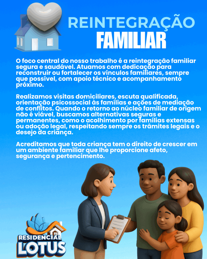 Residencial Lotus um lar onde o cuidado floresce. Oferecemos acolhimento institucional por meio dos serviços de Casa Lar e SAICA, garantindo cuidado, proteção e desenvolvimento integral para crianças e adolescentes.